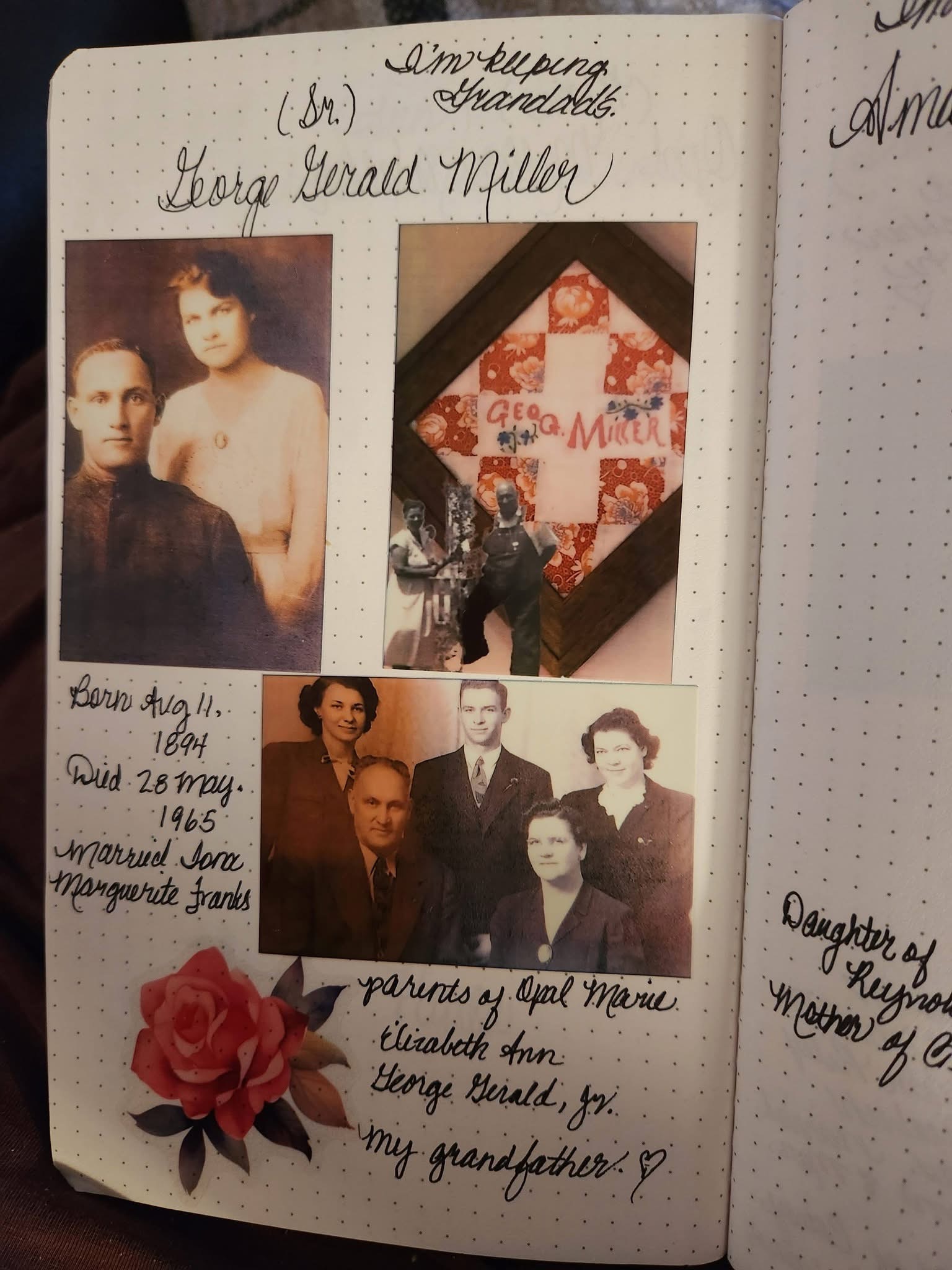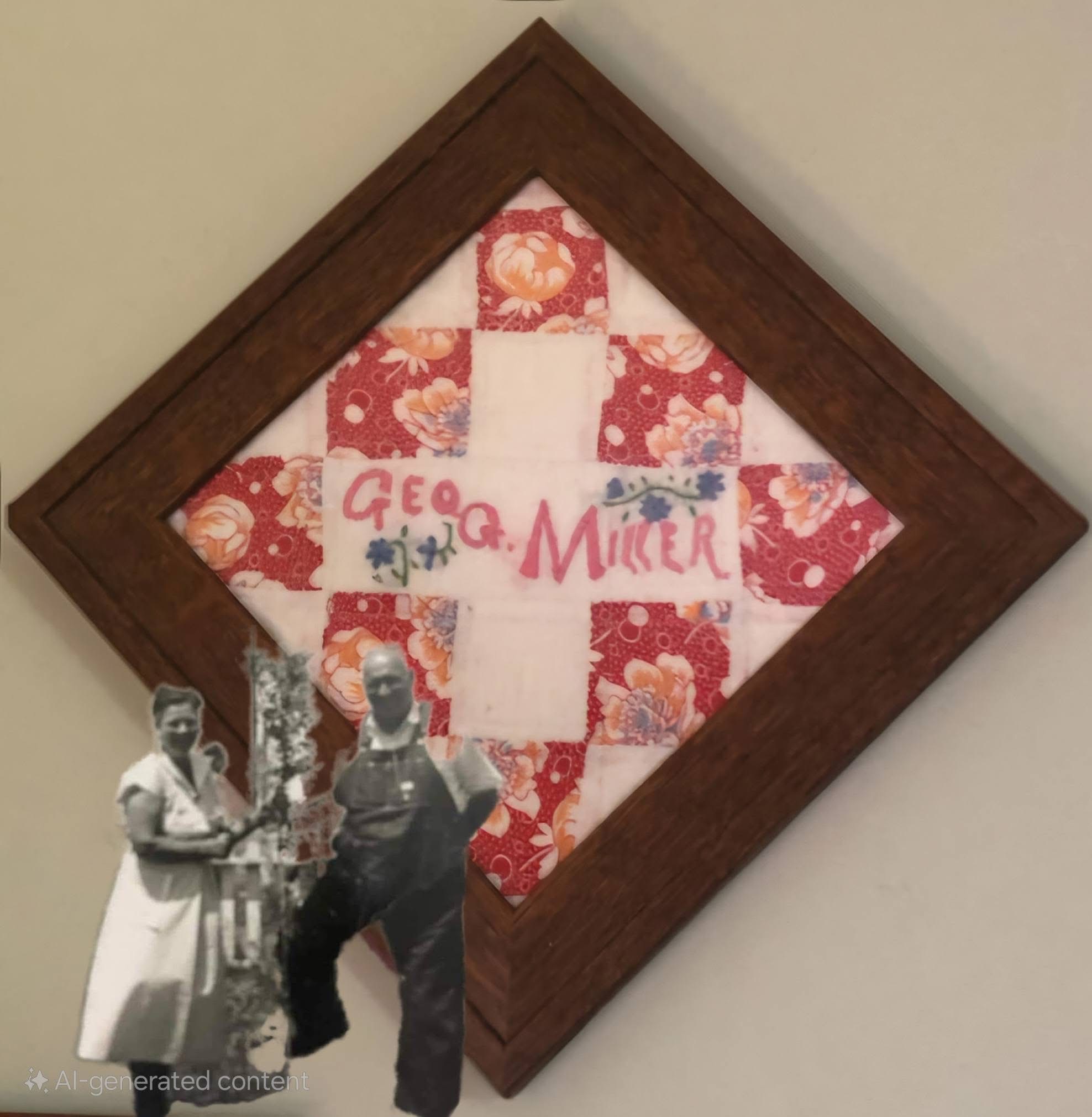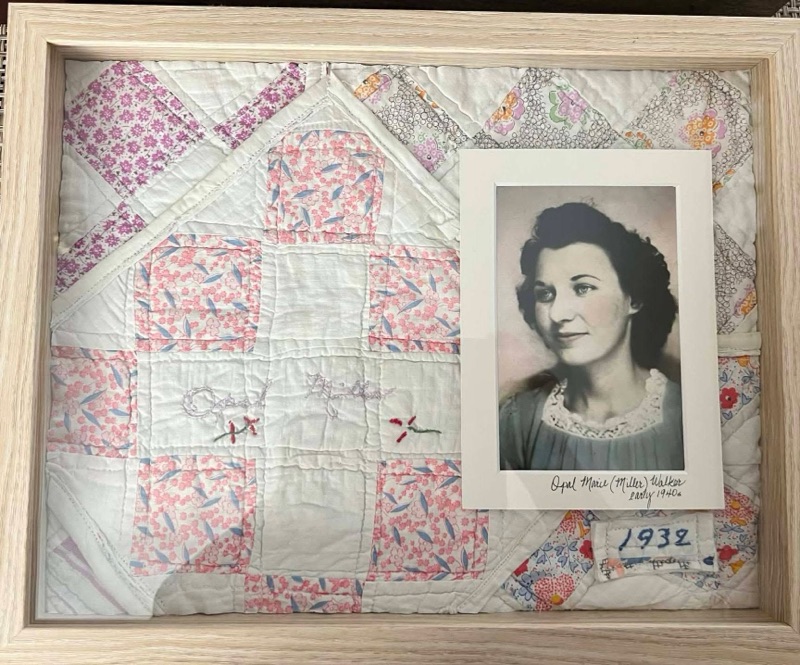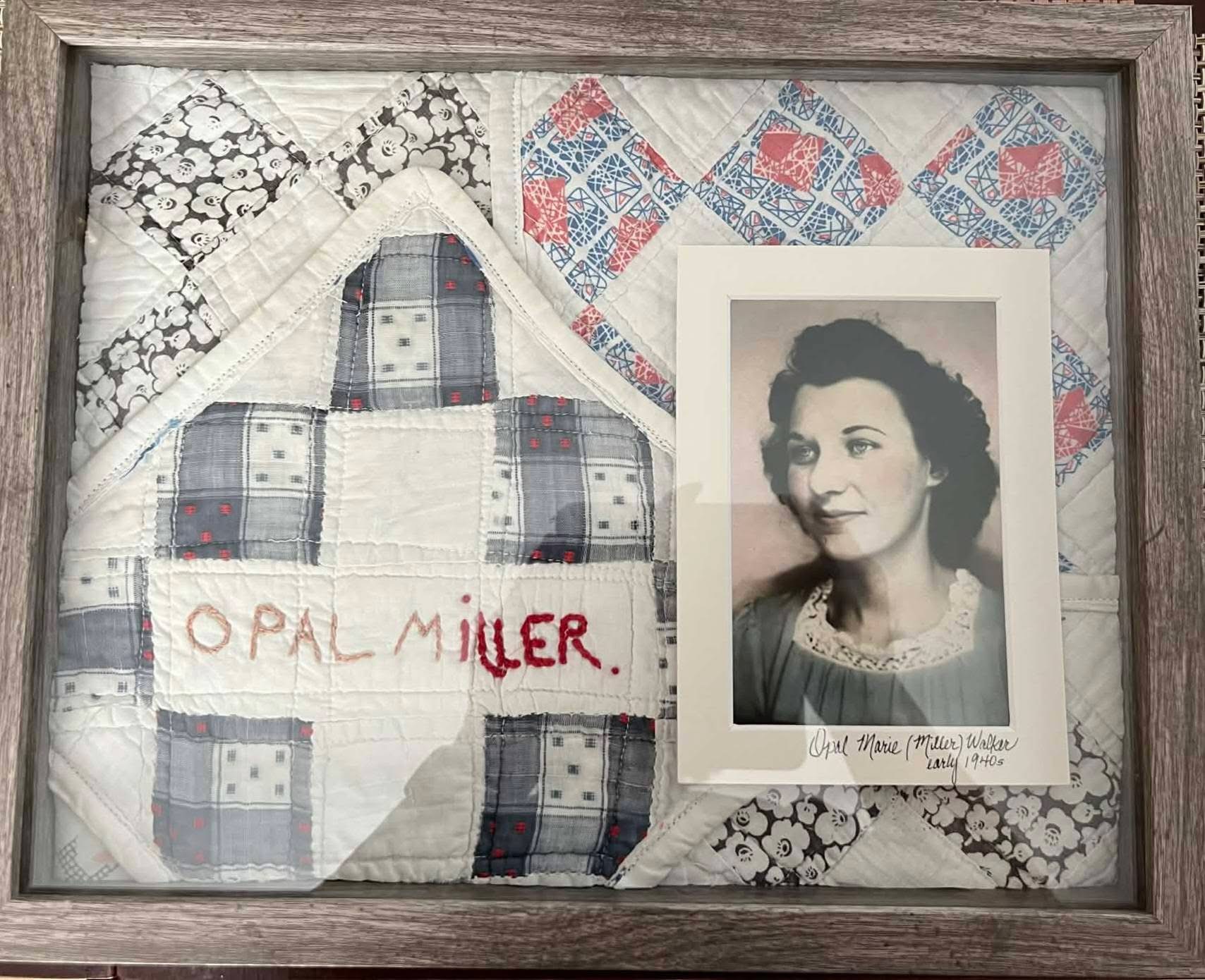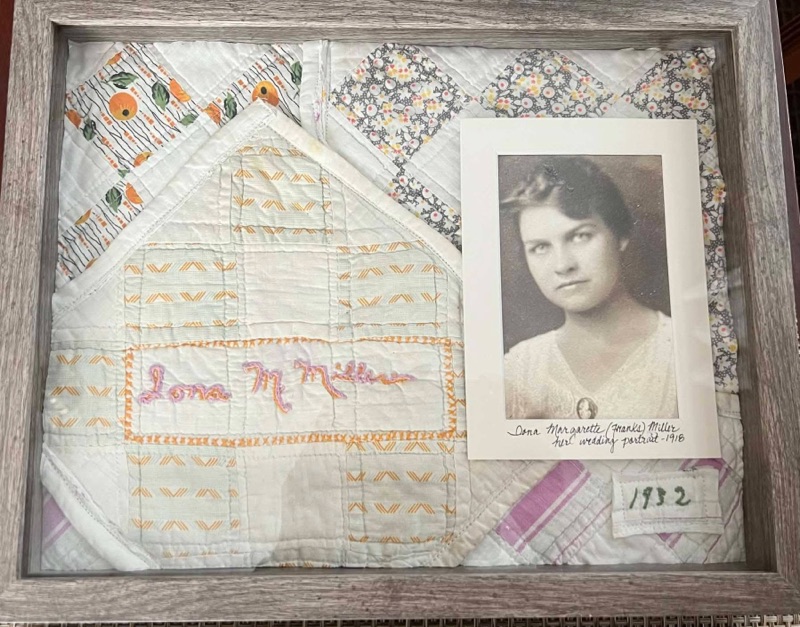 Our very most important core family blocks were divided with care. Susan kept our grandmother Iona‘s block, which was especially fitting since her daughter was named after Ma. Susan‘s mother, Opal, had made two blocks, so Susan kept one and gave one to her other daughter. Paula’s mother, Elizabeth, had also made two, and Paula gave those to her daughters. When we divided the remainder, Amanda Miller’s block landed in my stack, but Paula will soon have that block so that she has one to keep for herself. I kept the block signed by my grandfather George Gerald Miller, Senior. He was the only man on that quilt. Since my father was George Gerald Miller, Junior, that one felt especially right in my hands. Now these pieces are framed and beautiful, no longer folded away in the darkness. They are out where they can speak. Paula and Susan both made gorgeous quilt pictures for their daughters. We have given a few blocks away to a few cousins and friends.